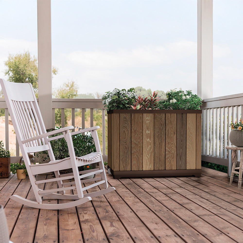 A Keter DecoCoat™ anyaga új generációs, UV-álló műanyag, amely természetes fafelületet imitál, miközben teljesen időjárásálló. Az integrált vízelvezető és víztartályos öntözőrendszer fenntartja az ideális talajnedvességet – így biztosítva egészségesebb növekedést a gyökérzónában. A magasított forma még hatékonyabb vízlevezetést biztosít, miközben esztétikusabb megjelenést is ad.