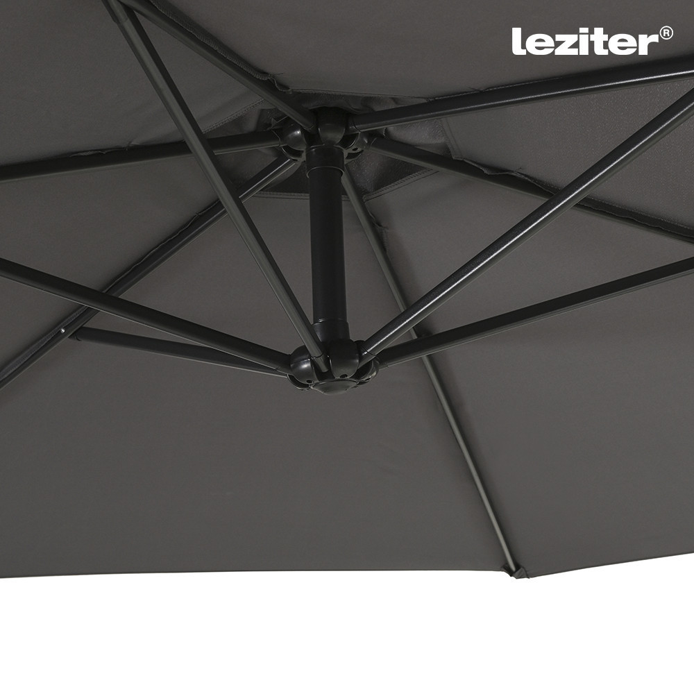 A Leziter Sunny kerti napernyő 300 cm átmérőjű kialakítással rendelkezik, amely egyenletes lefedést biztosít az árnyékolt területen. A kör alakú forma jól használható kertekben, teraszokon vagy kerti bútorok fölött. A ponyva kialakítása a mindennapi kültéri használathoz igazodik, felülete vízlepergető, így a nedvesség nem szívódik fel azonnal. A szürke szín világos, visszafogott megjelenést ad, amely könnyen illeszkedik különböző kültéri környezetekhez.