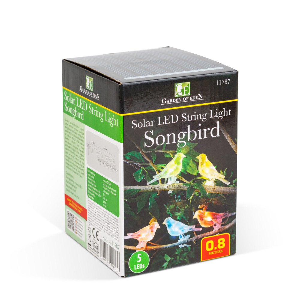 Varázsoljon különleges hangulatot kertjébe ezzel a bájos szolár fényfüzérrel, amely öt, csipeszes rögzítésű madárkát tartalmaz. A madarakat színes RGB LED-ek világítják meg, amelyek vidám, színekkel és élettel teli légkört teremtenek bármely kertben. Az egyszerűen rögzíthető fényfüzér hossza 80 cm, így ideális teraszok, erkélyek, növények vagy kerítések dekorálásához. Szolár energiaforrásának köszönhetően környezetbarát és energiatakarékos megoldás, mely napközben feltöltődik, szürkületkor automatikusan bekapcsol, napfelkeltekor pedig ki.
