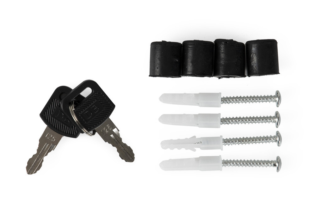 Together with the box, you will receive an assembly kit - 4 pins and spacers, so you can start installing the box right after unpacking. The set includes two keys to open the box.